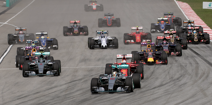 F1 cars during the first lap of the 2015 Malaysian Grand Prix. The 2015 Malaysian Grand Prix. Image available from Wikimedia Commons, licensed under the Creative Commons Attribution-Share Alike 4.0 International license.