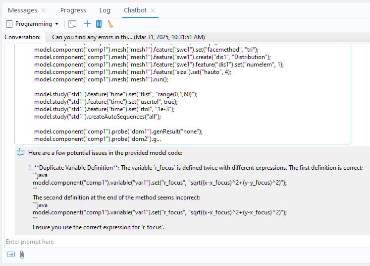 You can also use the Chatbot window to find simple mistakes in your modeling setup. While the chatbot functionality doesn’t understand all aspects of modeling and simulation, it can still be helpful; for example, it can identify typos in expressions used in the Model Builder.
