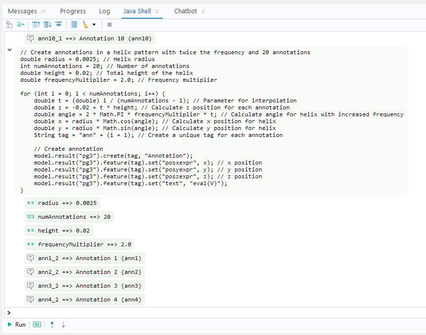 A close-up of the Java Shell window showing the generated code for creating the annotations. Click Run to plot the annotations as before.