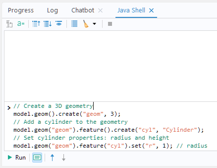 A close-up of the Java Shell window. Click the Run button at the bottom of the Java Shell window to generate the cylinder.