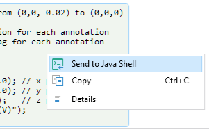 A close-up of the Send to Java Shell option highlighted in a shortcut menu. In the Java Shell window, click Run to apply the annotations.